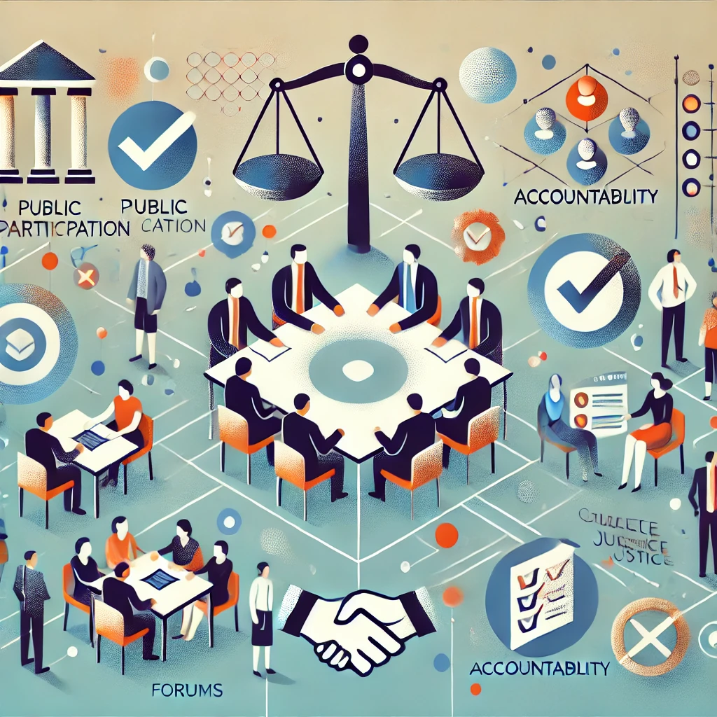 مشارکت عمومی یکی از ارکان اساسی حکمرانی خوب است. این مشارکت میتواند به شکلهای مختلفی در فرآیند سیاستگذاری و اجرای تصمیمات حکومتی بروز پیدا کند. از جمله این شیوهها میتوان به برگزاری جلسات مشورتی، مشارکت در تدوین برنامهها و استفاده از نظرات و پیشنهادات عمومی در تصمیمگیریها اشاره کرد.